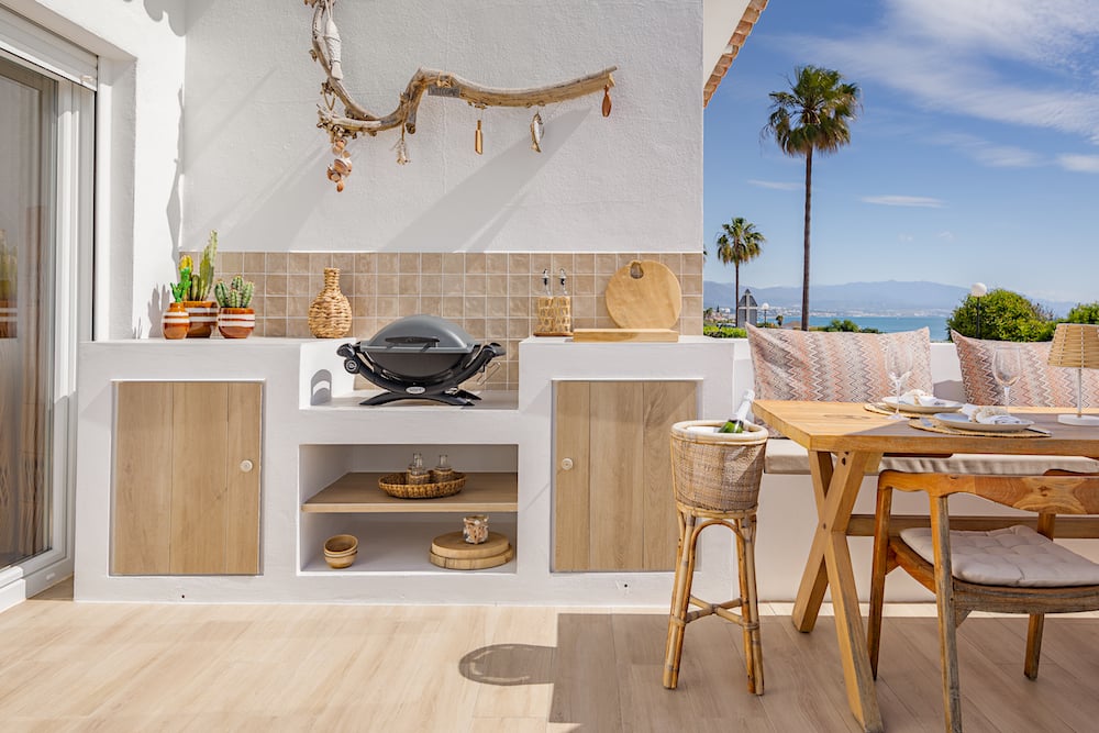 - Aan de andere kant vindt u het ruime terras (40m2) met zeezicht, een grote eettafel en een gezellige loungehoek. Ook staat er een (elektrische) barbecue tot uw beschikking.