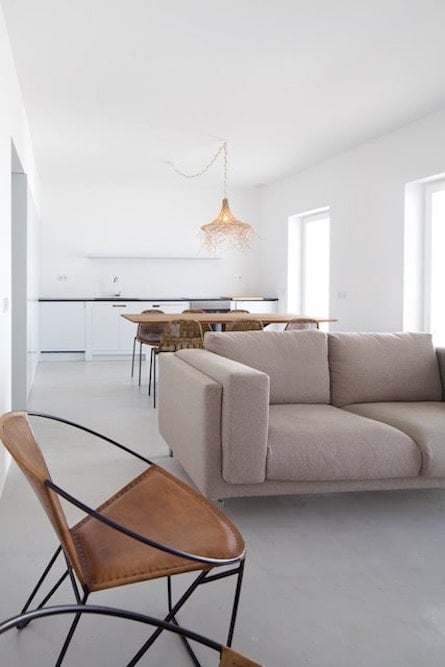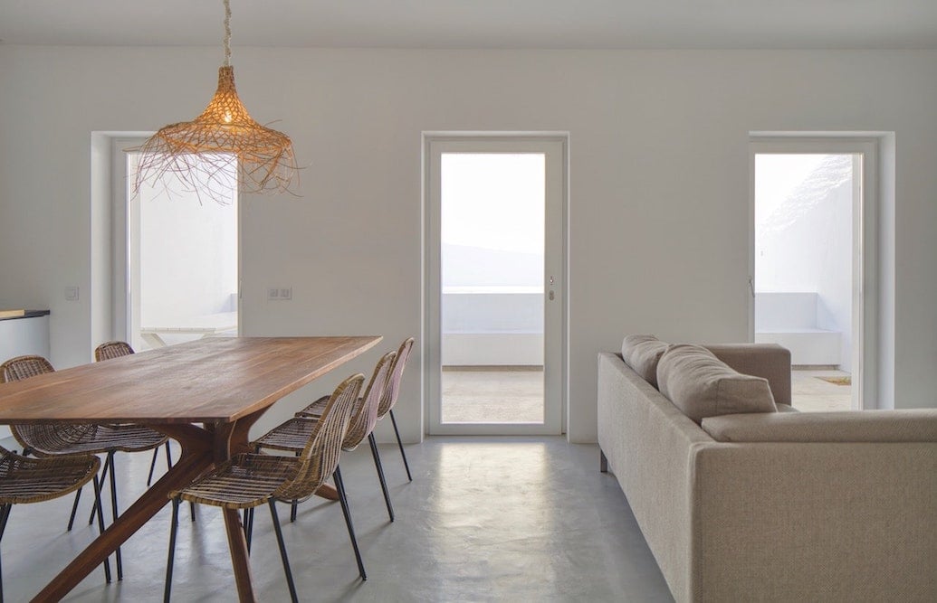 - Open woonkamer met een comfortabele bank, een houtkachel, een houten eettafel en een volledig uitgeruste keuken. Deuren openen op het terras.