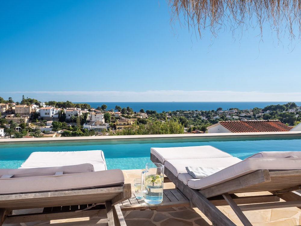 Het terras aan de voorkant van de woning biedt ook toegang tot een trap die u beneden naar het zwembad brengt. Onderweg naar beneden komt u de 4e slaapkamer tegen met ensuite badkamertje.