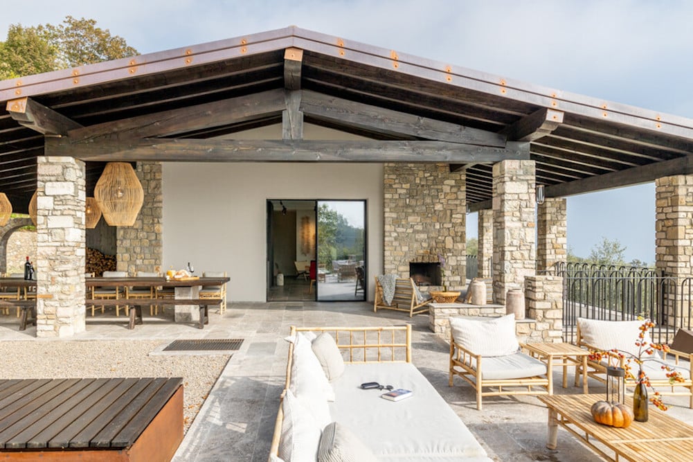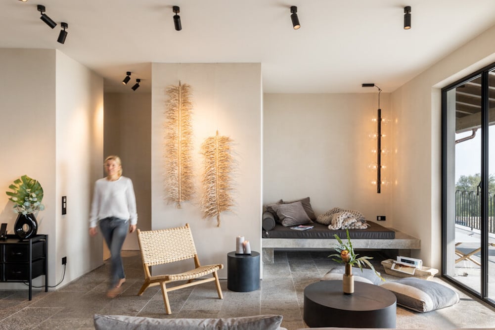 - In de living vindt u langs de gehele breedte van de villa grote stalen ramen, die uitgeven op het balkon met ligbedden en het grote terras naast de keuken. Op dit terras vindt u de overdekte zes meter lange eettafel en de buitenkeuken met houtgestookte oven.