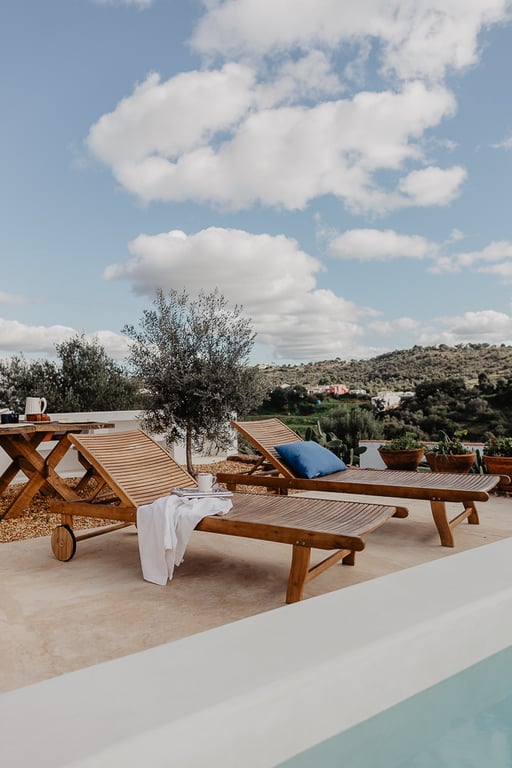 - Privézwembad omgeven door meerdere ligstoelen, perfect om te genieten van de zon van de Algarve.