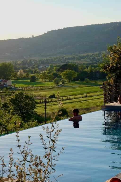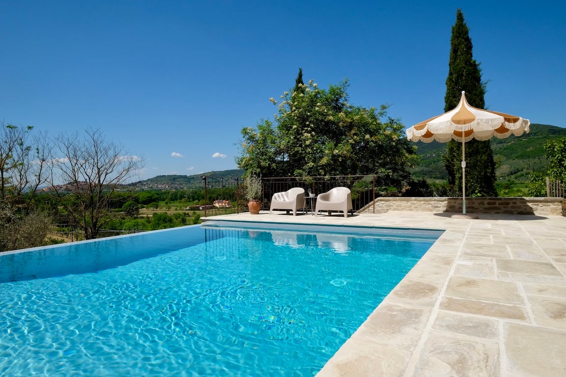 - Zoutwater infinity zwembad (12x5.50m, het diepste gedeelte van het zwembad is 250cm diep) met ligbedden en buitendouche en prachtig uitzicht over de eigen olijfgaard en het dorp