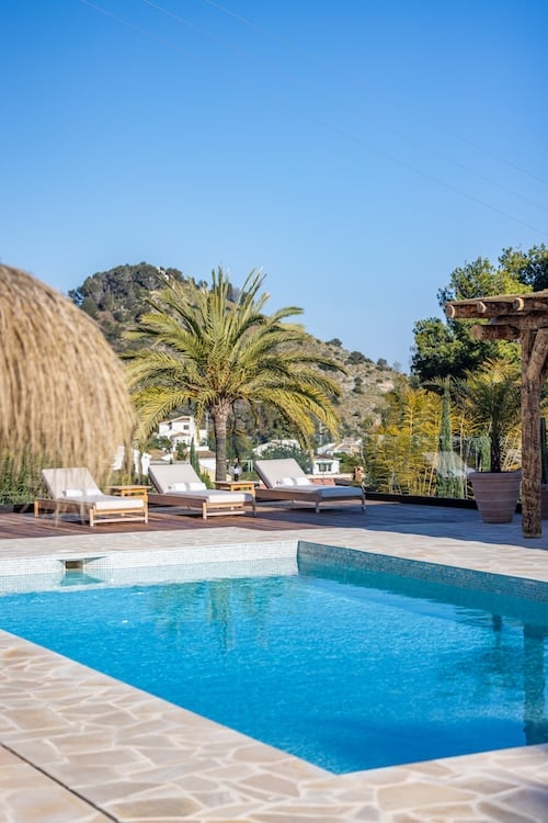 Buiten draait alles om het goede leven: een royaal zwembad met luxe ligbedden, een pergola waar lunches in de schaduw langzaam overgaan in siësta’s en verschillende terrassen voor ontbijt met uitzicht op de bergen of diner onder de sterren. De tuin is een oase van mediterrane geuren, met citrusbomen, bougainville en lavendel.