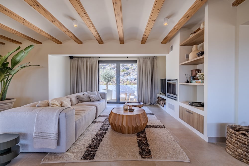 Binnen ademt het huis een elegante mix van modern comfort en warme, ‘bohemian’ invloeden. Zachte aardetinten, natuurlijke materialen, houten balken en zorgvuldig gekozen details zorgen voor een stijlvolle en serene sfeer. Elke ruimte straalt kwaliteit en aandacht uit – van de op maat gemaakte meubels tot de smaakvolle verlichting.