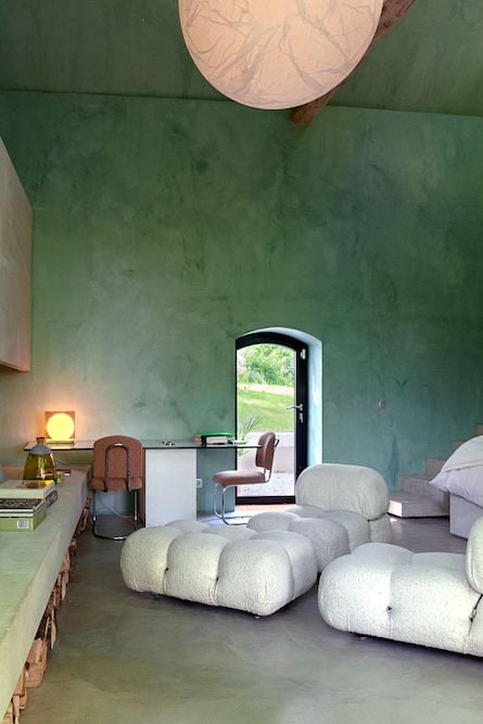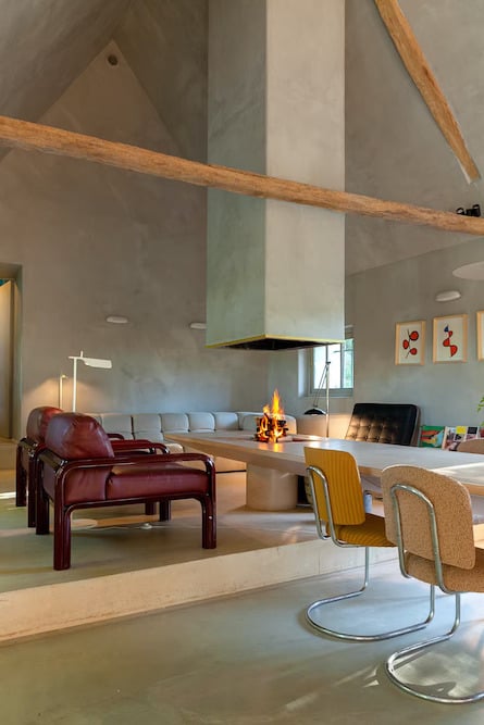 - De eetkamer-keuken-woonkamer, met een grote betonnen tafel van 5 meter lang en een centraal eiland met een binnenbarbecue, kookplaten en inductiewok, is de ademruimte van het huis geworden en de plek om samen te komen.
