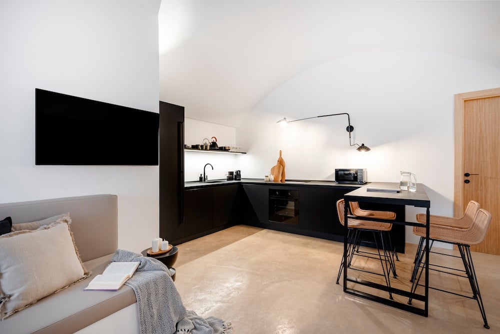 - De keuken komt uit op een woonkamer met twee comfortabele banken en een smart-televisie