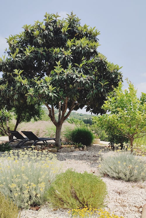 - Weelderige tuin met planten, bloemen en olijf- en fruitbomen.