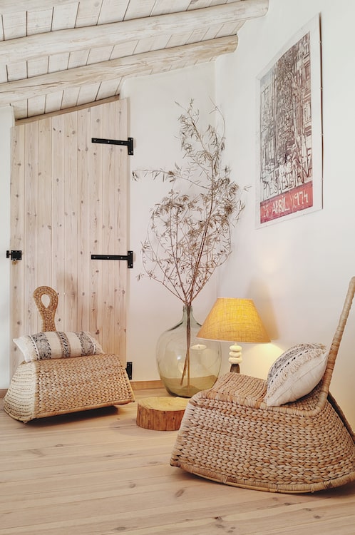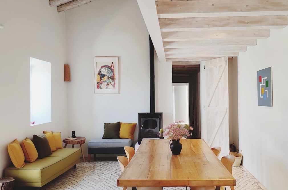 - Alle meubels en decoraties zijn vintage of hergebruikt. Veel van de meubels komen van de Brusselse antiekmarkt. Ook zijn bijvoorbeeld de originele dakpannen van het huis gebruikt als lampen en zijn de prachtige wastafels in de keuken en badkamer gemaakt van steen uit de tuin.