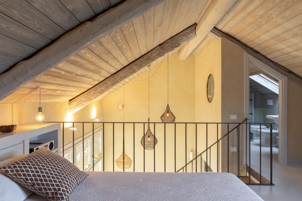 Tussen de woonkamer en de keuken gaat een trap naar de bovenste verdiepingen. Hier vindt u: