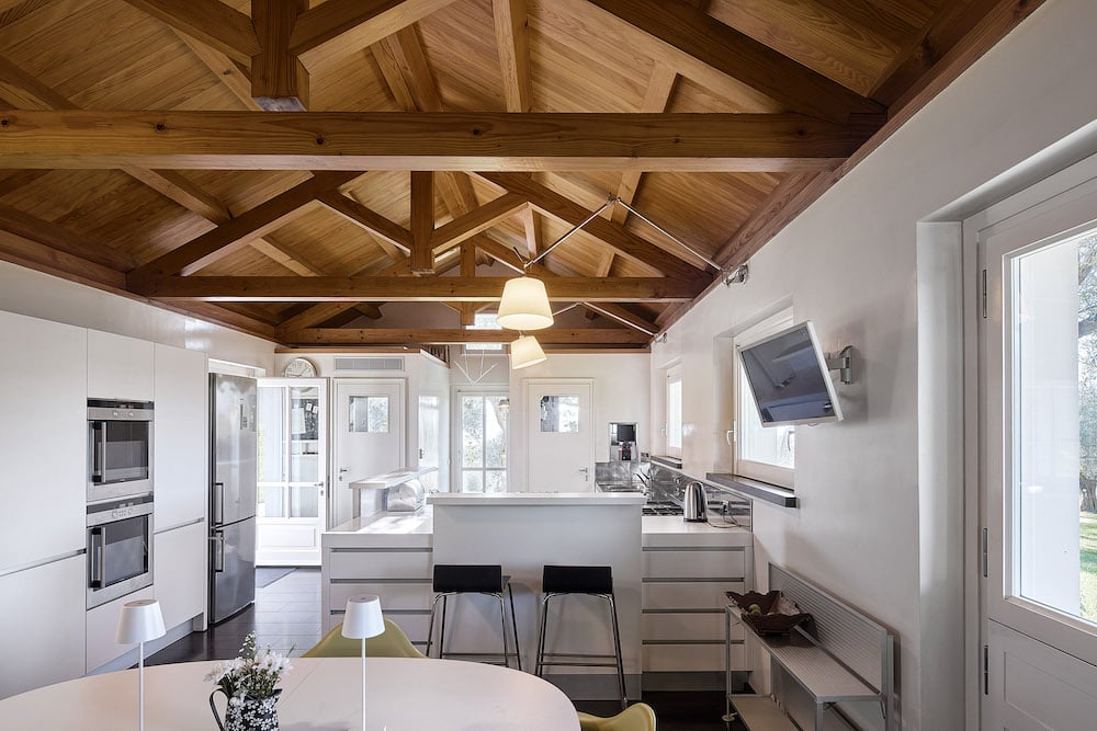 - Open keuken met eiland en volledig uitgerust met essentiële apparatuur zoals een espressoapparaat, koelkast, vaatwasser, fornuis en oven. Aangrenzend bevindt zich een open haard en een kleine eettafel voor 4 personen.