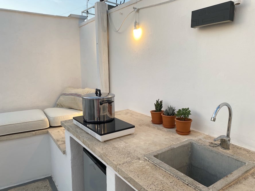 - De buitenkeuken beschikt over een wasbak, koelkast, inductiekookplaat en Weber barbecue.