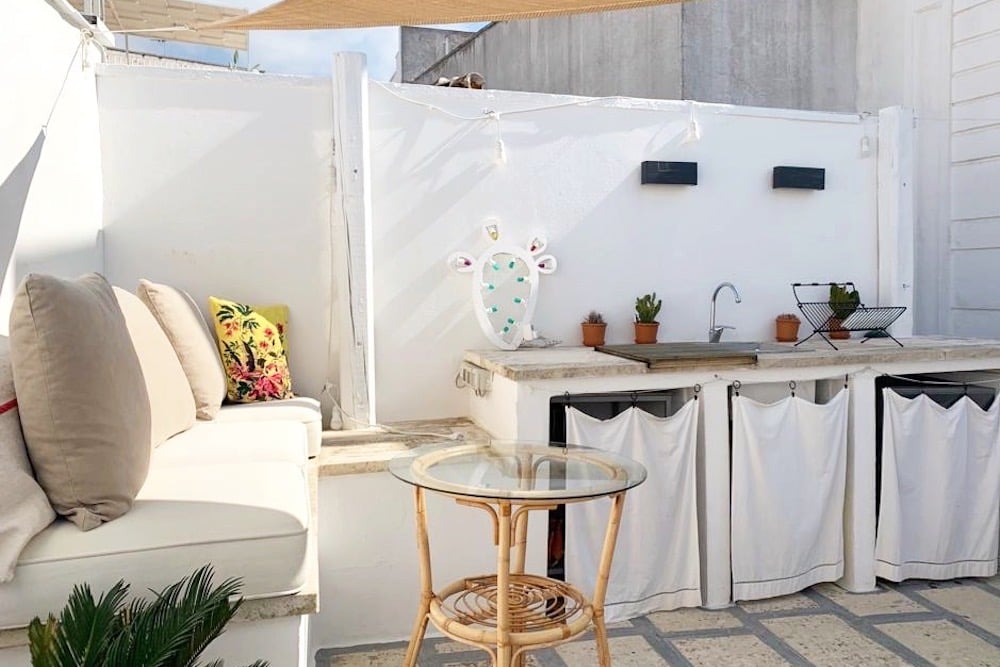 - Via een externe trap bereikt u het dakterras met een buitenkeuken, ingemetselde bank met zitkussens en een eettafel.