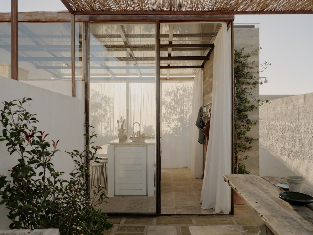 - De keuken is omgeven door een ijzeren en glazen structuur, met aan weerszijden een eethoek en een ontspanningsruimte met een grote bank en veel planten.