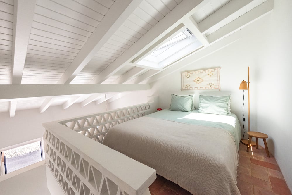 - Een trap brengt u naar de mezzanine met een tweepersoonsbed (160cm x 200cm)