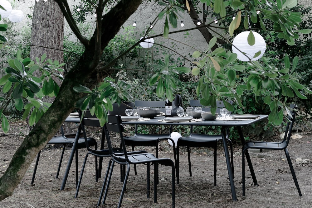 - Een Fermob eettafel, beschut door de schaduw van de pijnbomen.