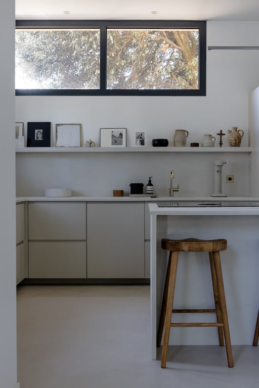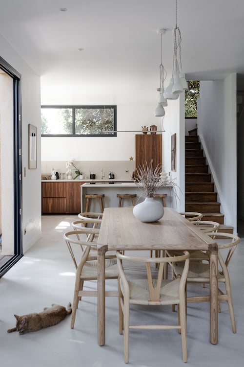 - Open design keuken met kookeiland annex bar. De keuken is uitgerust met: espressomachine, waterkoker, oven, vaatwasser, grote koelkast en vriezer, inductiekookplaat met ingebouwde afzuiging, broodrooster, blender en verdere kookbenodigdheden. Naast de keuken staat een extra eettafel, met uitzicht op de tuin.