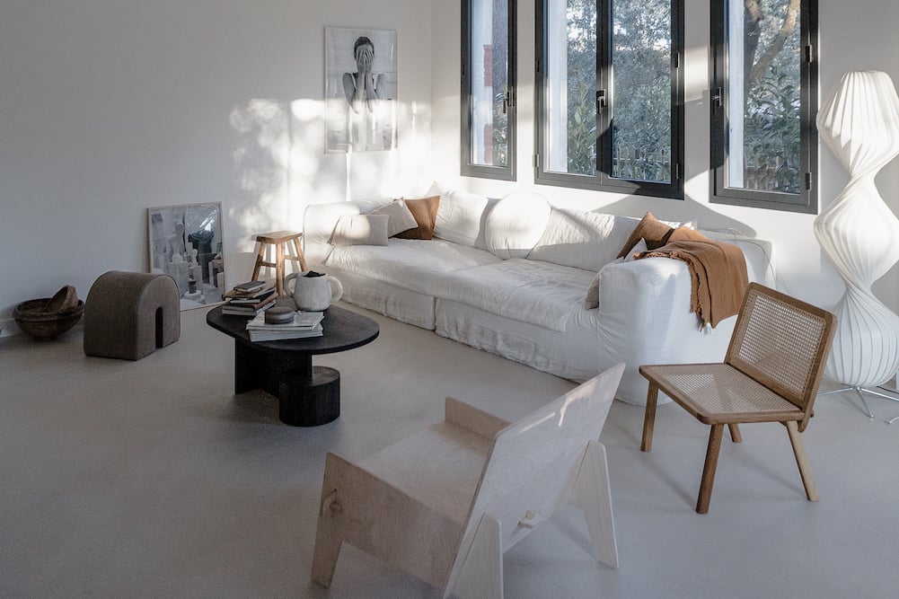 - Ruime, open living met een grote linnen bank van Bed and Philosophy, verschillende design stoelen en een Apple-tv met streaming functie.
