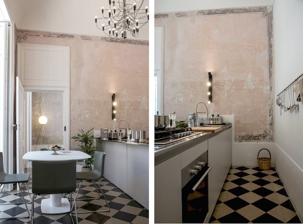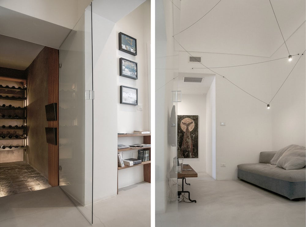 - De entree - gekenmerkt door de minimalistische uitstraling van de gepolijste betonnen vloer - komt uit in de woonkamer en naastgelegen bijzondere wijnkelder met een oude majolica-vloer.