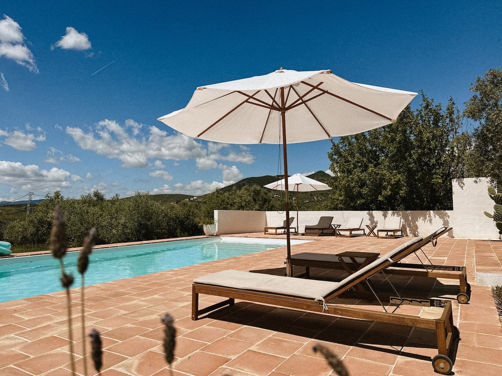 Rondom het zwembad ligt een betegeld terras met 6 loungebedde en 2 parasols