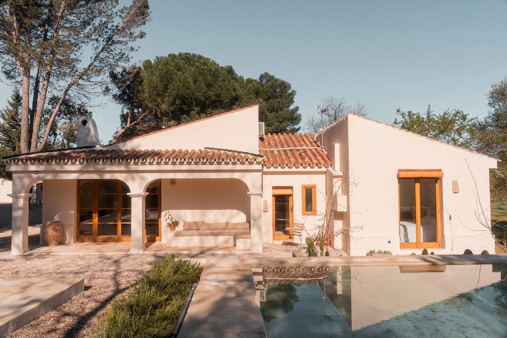 Buiten ontvouwt zich het echte vakantiegevoel. Het zwembad ligt uitnodigend in de zon, omringd door ligstoelen en groen. Onder het overdekte terras staat een grote houten picknicktafel waar lange lunches of diners vanzelf ontstaan. Hier leeft u buiten, van ochtendkoffie tot zonsondergang.