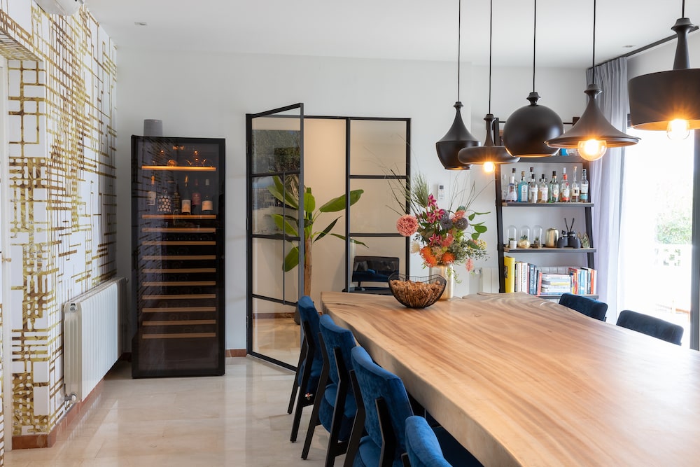 - Een ruime woonkeuken, volledig uitgerust met grote en kleine apparatuur, waaronder: een wijnkoelkast, ingebouwde koelkast en vriezer, inductiekookplaat, traditionele oven, combimagnetron, stoomoven, quooker tapkraan, koffiezetapparaat, elektrische grill, blender, vaatwasser en verdere kookbenodigdheden.