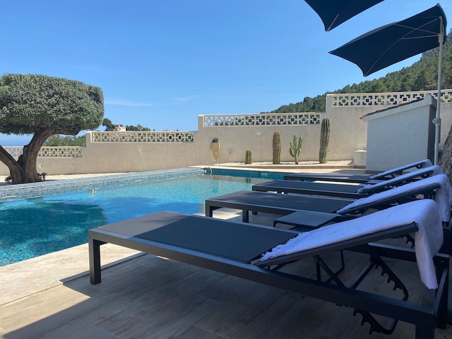 De buitenruimtes van Casa van Wely zijn groots: een weelderige tuin met grote palmen, cacti, oude olijfbomen, heerlijke loungeplekken en en prachtig uitzicht over de Costa Blanca.