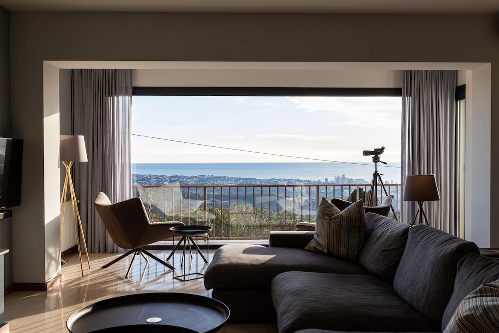 - Ruime living met uitzicht op de zee in de verte, een zitgedeelte rondom de design open haard en een kleine eettafel. Ook vindt u hier de smart-tv. De tablet voorzien in muziek, streaming diensten en regelt de verlichting.