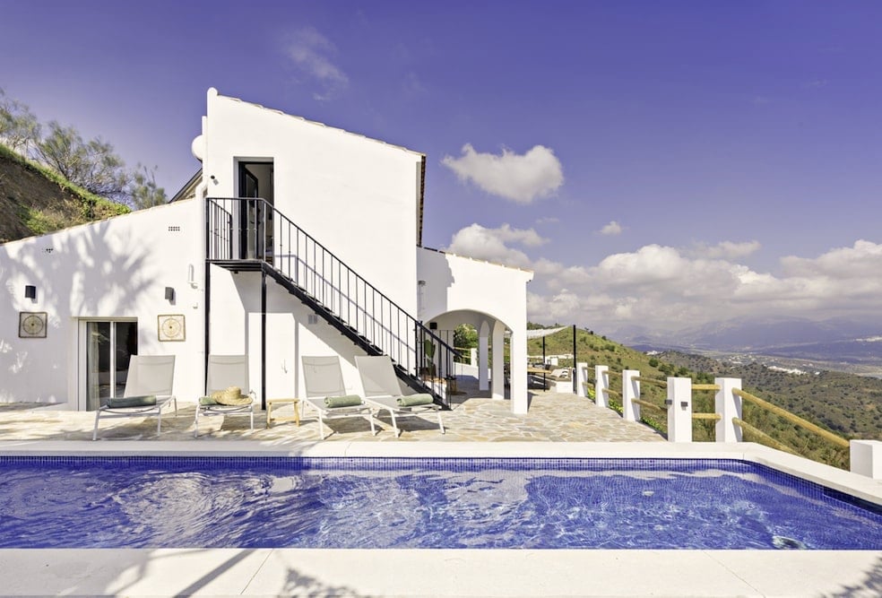 - De master slaapkamer | 20 m2 | bevindt zich op de 1e verdieping (buitenom bereikbaar), afmeting bed 180x200 cm, kledingkast, airconditioning en uitzicht over het meer van Vinuela. Ensuite badkamer met ligbad, inloopdouche, toilet, wastafel