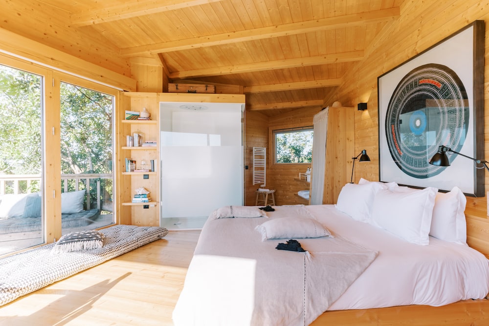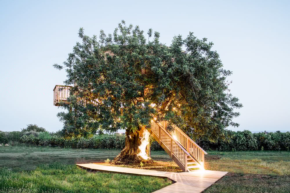Zes en een halve meter boven de grond, op de top van een Johannesbroodboom en volledig gemaakt van hout, is de boomhut de meest speciale kamer van Conversas de Alpendre.