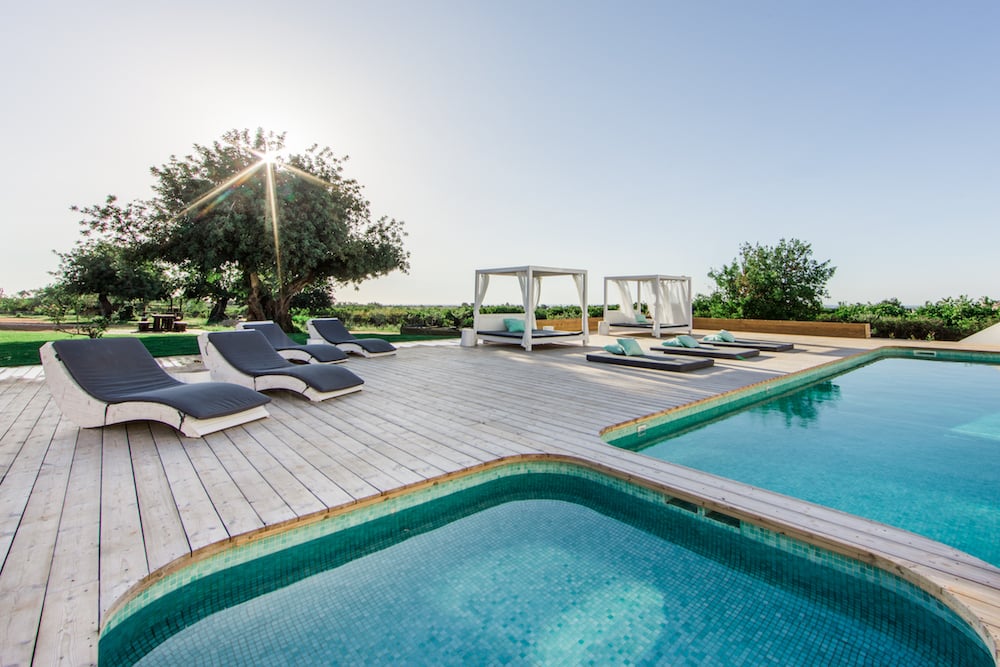 - Rondom het zwembad staan luxe tweepersoonsdagbedden onder witte pergola’s en comfortabele rieten loungestoelen en ligbedden.