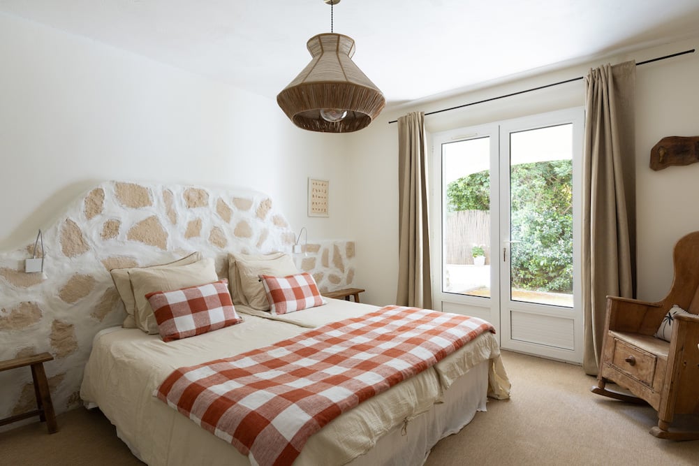 - De derde slaapkamer, met 2 eenpersoonsbedden (90x200cm), ligt aan de achterzijde van de villa en heeft een ingebouwde kast en openslaande deuren naar de tuin en het terras.
