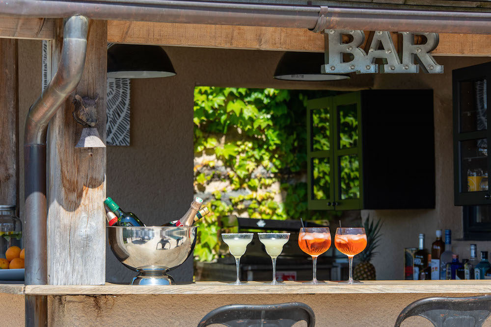 - Een verwarmd en beveiligd zwembad (12x 6m) dat wordt omringd door een groot zonneterras met ligstoelen, lounge bedden, parasols en een buitendouche. Hier bevindt zich tevens een (pool) bar, barbecue en diverse zitjes.
