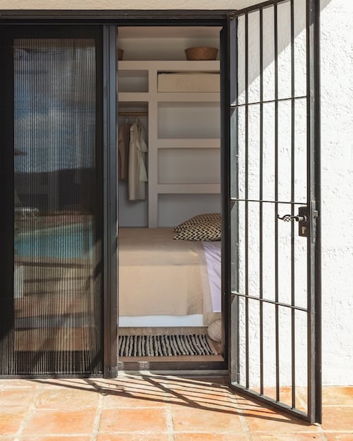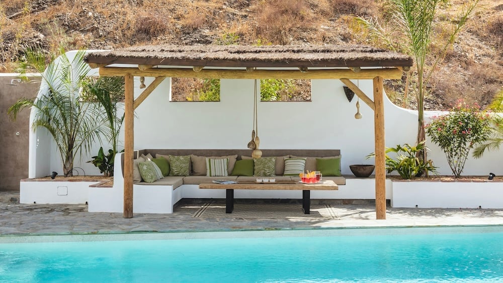 Buiten draait alles om het uitzicht. Op het overdekte terras staat een grote eettafel, er is een buitenkeuken en een lounge hoek in de schaduw. Het verwarmde zoutwaterzwembad lijkt over te lopen in het dal, een plek waar de tijd stilvalt. Hangmatten, zonnebedden en rieten parasols maken het beeld compleet.