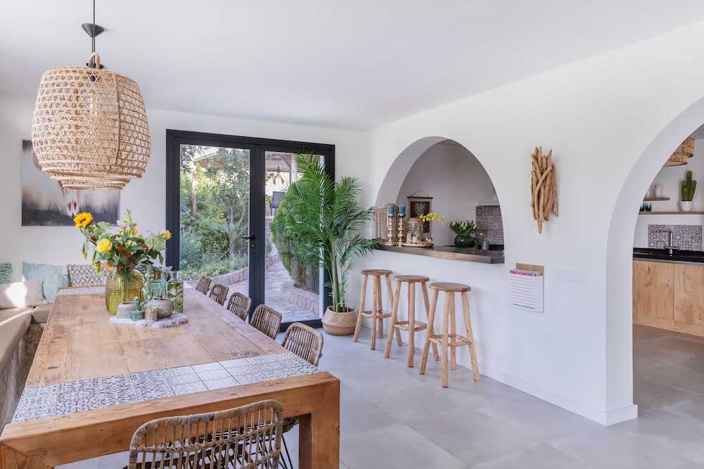 - In de eetkamer staat een grote eettafel met openslaande deuren naar de buitenkeuken