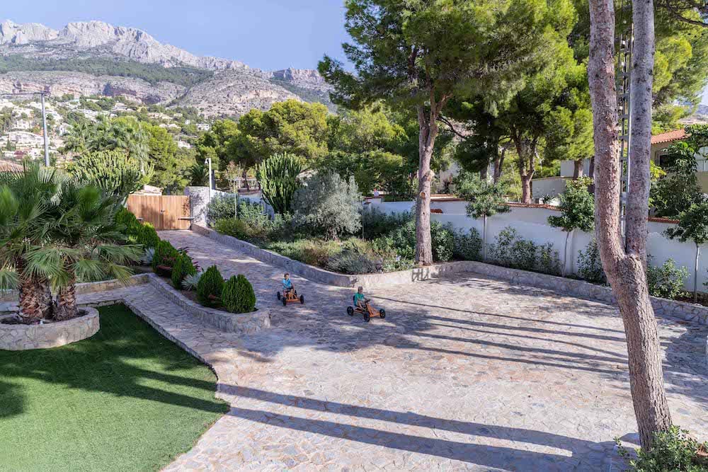 - De tuin van zo'n 2000 m2 is vlak en helemaal ommuurd. De tuin is nieuw aangelegd, maar beschikt ook nog over oude bomen zoals o.a. de dennenbomen, de Jacaranda, Johannesbroodpitboom en de rode peperboom, die voor schaduwplekjes zorgen. Het is een echt paradijs met palmen,olijfbomen en een fruitboomgaard.