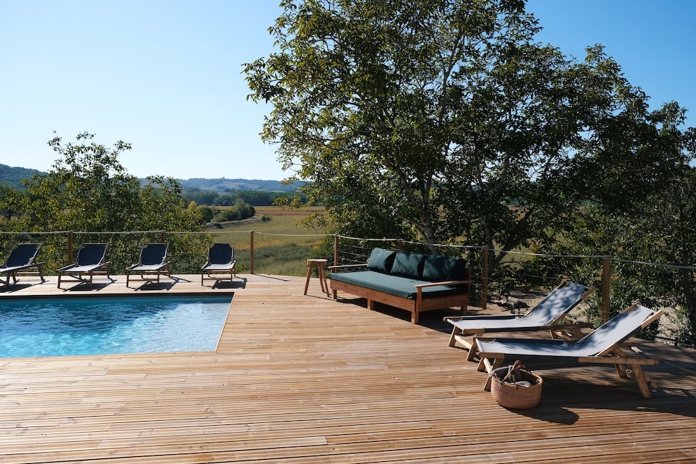 - Rondom het zwembad en de jacuzzi staan ligbedden, op maat gemaakte sofa’s, parasols en er is een buitendouche (warm water)