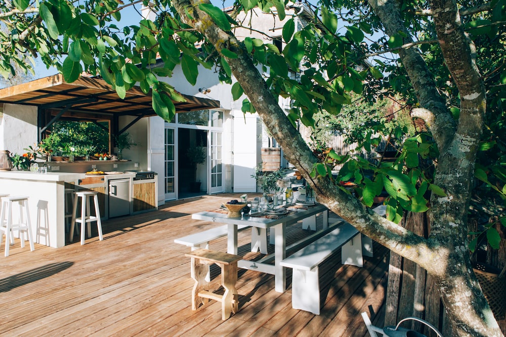 - Groot houten terras (300m²) met eettafel voor 15-20 personen in de schaduw van de bomen, een buitenkeuken met een bargedeelte, brasero (grill) en plancha