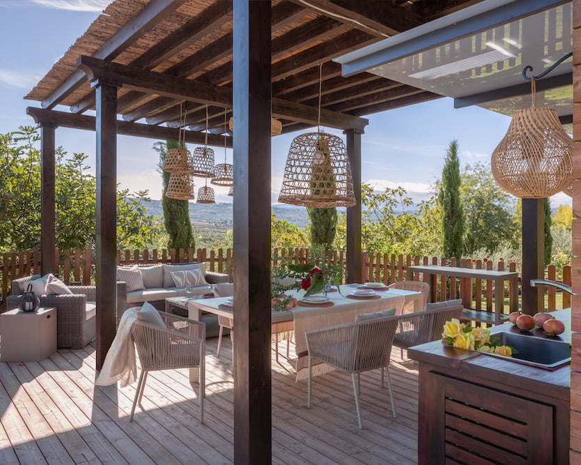 - Twee overdekte terrassen zijn perfect om buiten te eten. Een daarvan heeft een eettafel voor 14 personen, een barbecue en een kleine buitenkeuken.