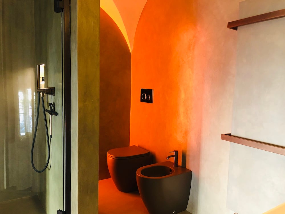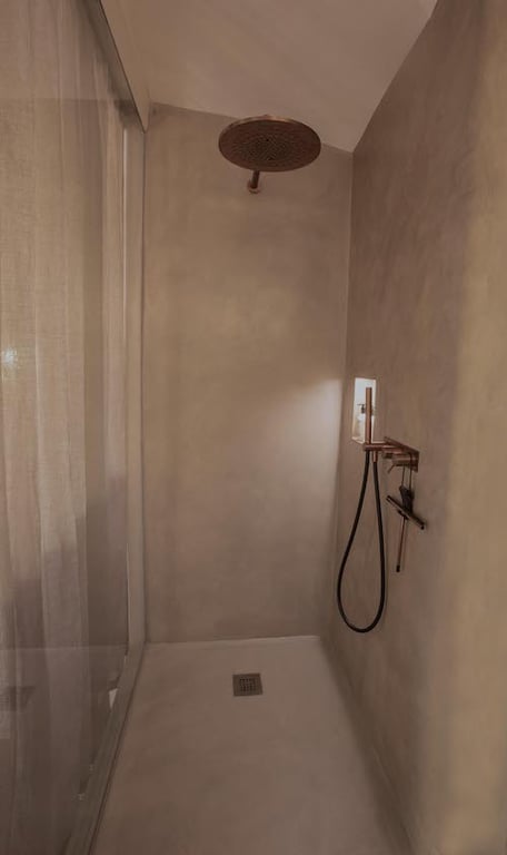 - Boven vindt u de moderne badkamer voorzien van dubbele betonnen wastafels, een zeer ruime regendouche, een toilet, en een bidet. Zachte handdoeken en verzorgingsproducten liggen voor u klaar.