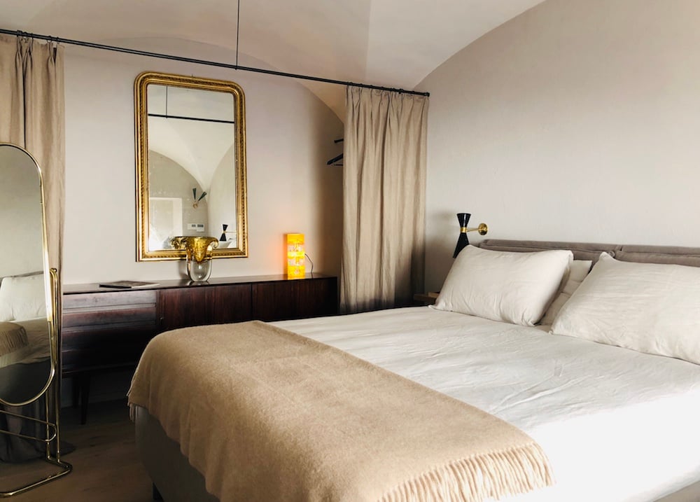 - Nasst de badkamer ligt de ruime slaapkamer met een tweepersoonsbed (180x200cm) dat is opgemaakt met Egyptisch katoen, een opbergruimte dat afgesloten kan worden met een gordijn en een dagbed bij het raam.