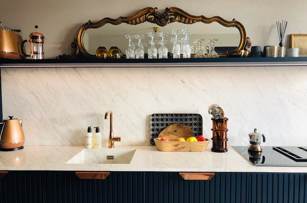 - De keuken is uitgerust met alle moderne apparatuur inclusief een inductiekookplaat, magnetron/oven combinatie, vaatwasser, koel/vrieskast, koffiemachine, kookgerei en koperkleurige accessoires (zoals een waterkoker, cafetière en broodrooster).