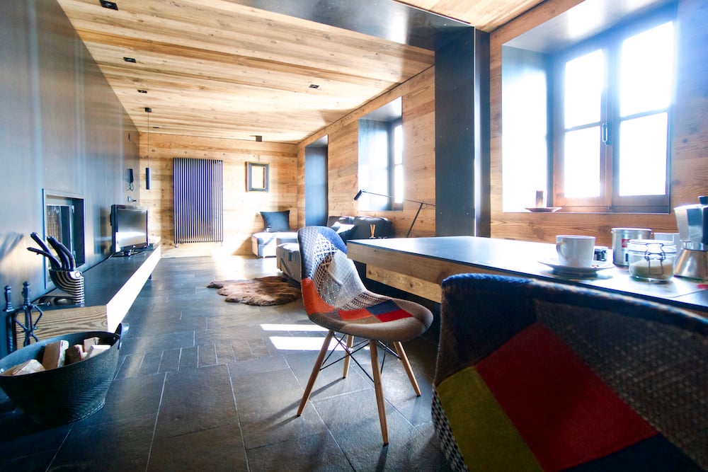 Het appartement Anima Monti ligt op de tweede verdieping en vertegenwoordigt het hart van het huis. Het interieur wordt gekarakteriseerd door een donkere leistenen vloer, met hout beklede plafonds en wanden en een minimalistisch design. U betreedt het appartement in de ruime open living welke is voorzien van een moderne sofa, open haard, houten bank, eettafel met stoelen In deze ruimte bevindt zich tevens een kitchenette met keramische kookplaat, vaatwasser, koelkast, toaster, en waterkoker. Er zijn twee slaapkamers beide voorzien van een tweepersoonsbed De moderne badkamer is uitgerust met een toilet, wastafel en douche. Het appartement heeft 2 terrassen met prachtig bergzicht.