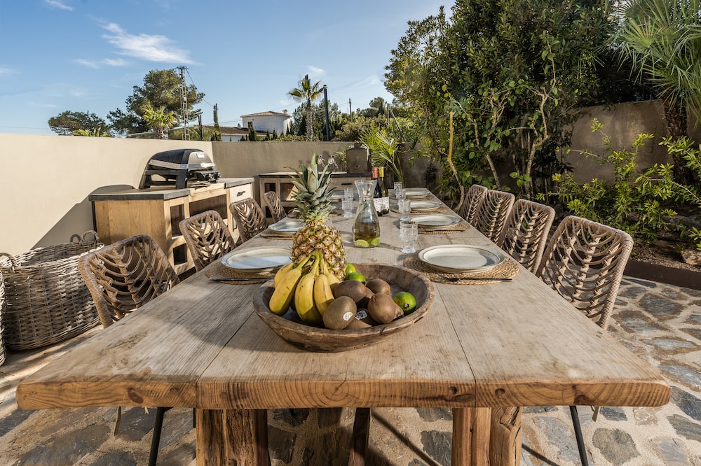 - Daarnaast is er een zonnig terras met een lange eettafel voor 12 personen en een bbq.
