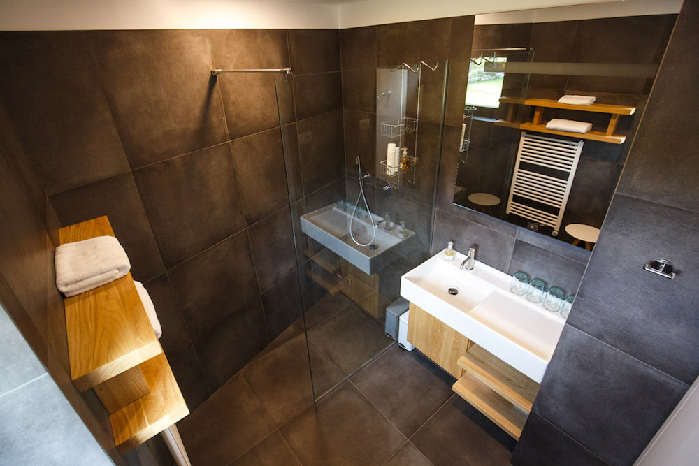 - Ruime badkamer met een inloopdouche, wastafel en toilet.