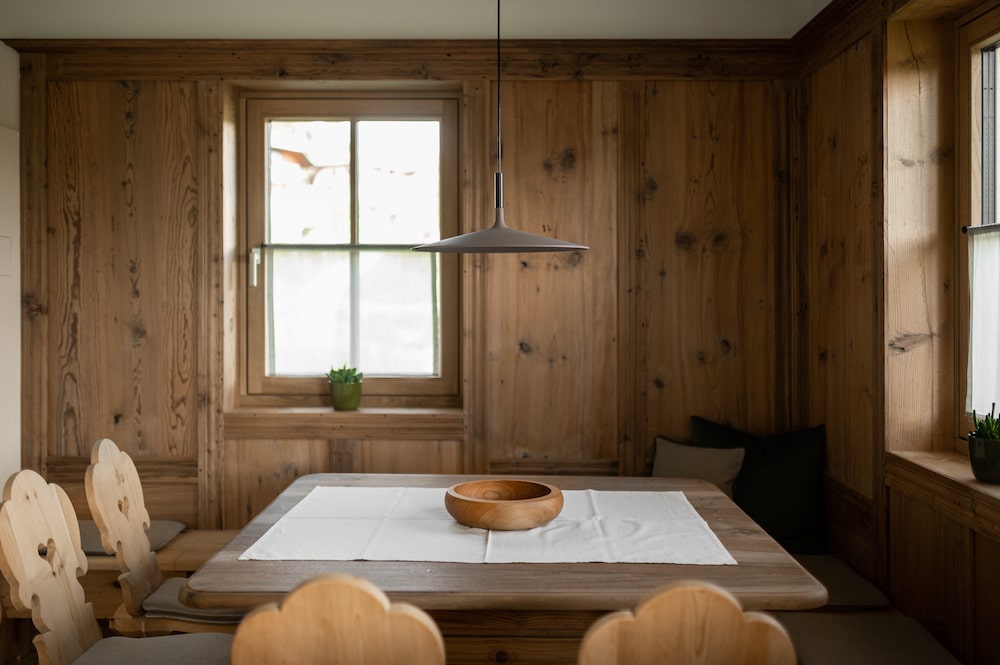 - Een open woonkamer met een panorama raam, een zithoek met een sofa bed (waar een 5e persoon kan slapen), een bureau met twee werkplekken en een eethoek; een originele oude Stube met eettafel en banken. Een deur achter in de woonkamer opent op het terras met buitenmeubilair.