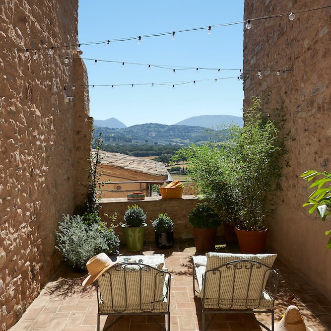 - Openslaande deuren geven toegang tot een mooi privé terras dat uitkijkt over de straten van Spello en verderop de Umbrische heuvels. Op het terras staan twee ligbedden, twee loungestoelen en een tafeltje.