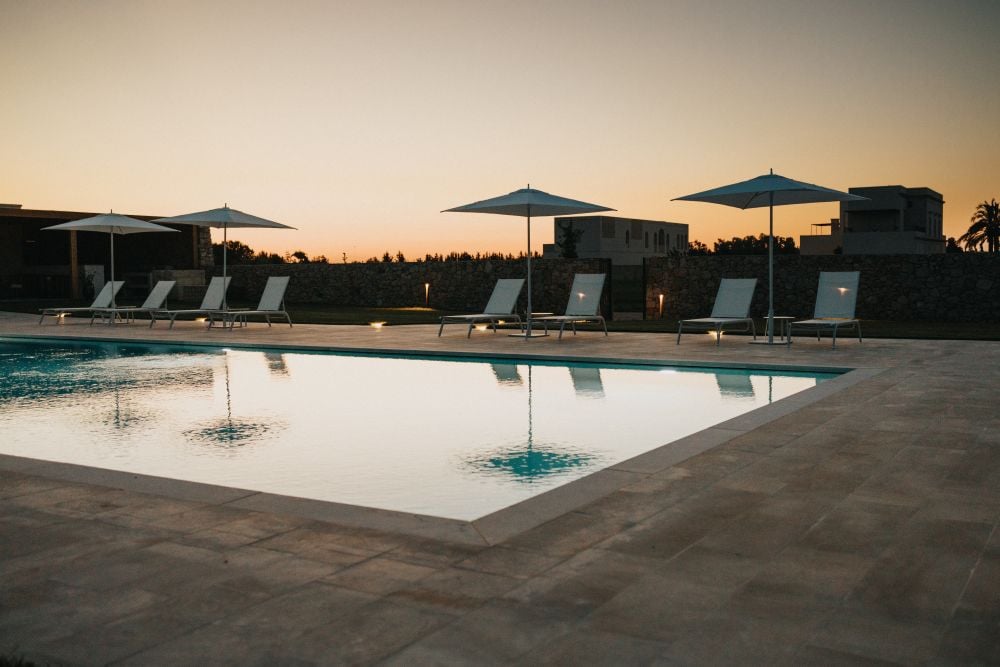 - Groot buitenzwembad (18x8m met een diepte van max. 1,40m). Het zwembad is open van mei tot oktober en wordt omringd door een zonneterras met ligbedden, parasols en een buitendouche