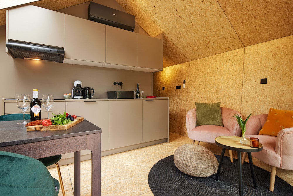 - Een open woonruimte met een volledig uitgeruste keuken en een een eettafel