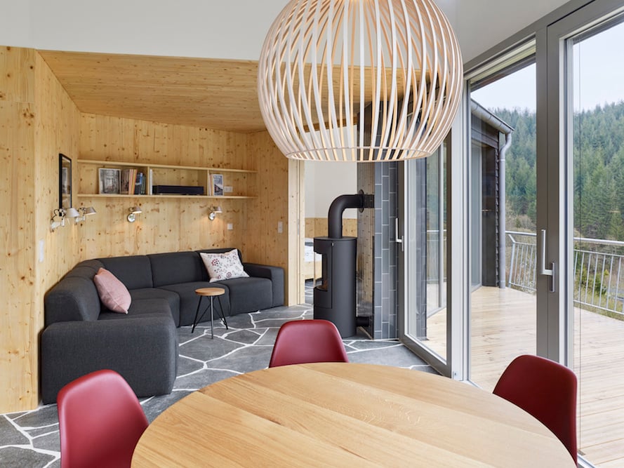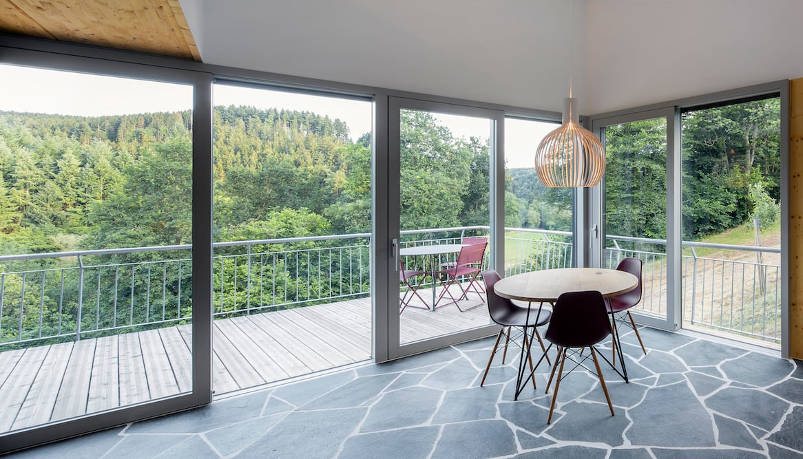- Open woon/eetkamer en keuken met een zithoek bij de houtkachel, een eettafel en plafondhoge ramen die toegang bieden tot het panoramische balkon met een eettafel.