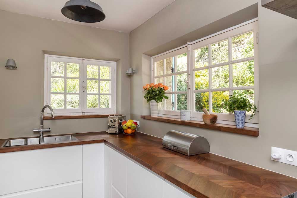 - De moderne keuken is uitgerust met een inductiekookplaat, twee ovens, een magnetron, een espressomachine, vaatwasser en een koel/vrieskast. Het kookgerei is van hoge kwaliteit en er is servies en bestek voor 10 personen. Het grote aantal kasten biedt goede opslagruimte en houdt de keuken opgeruimd. De gootsteen is uitgerust met een kraan die kokend water kan leveren (Quooker).
